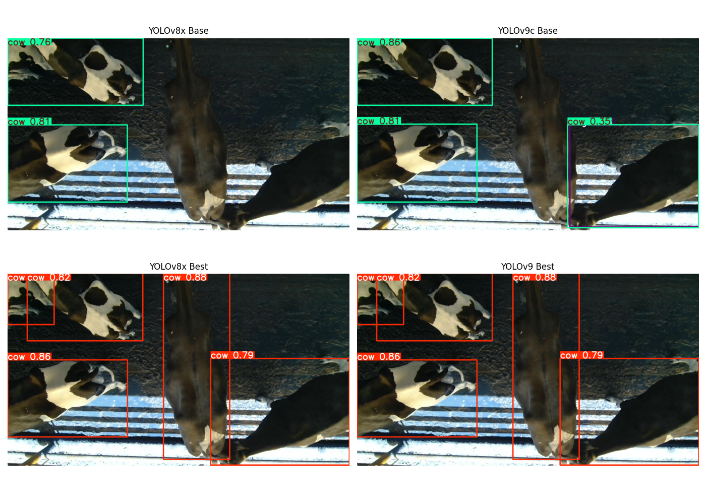 - Base models: YOLOv9c detected more cows with higher confidence (0.86 vs 0.76)