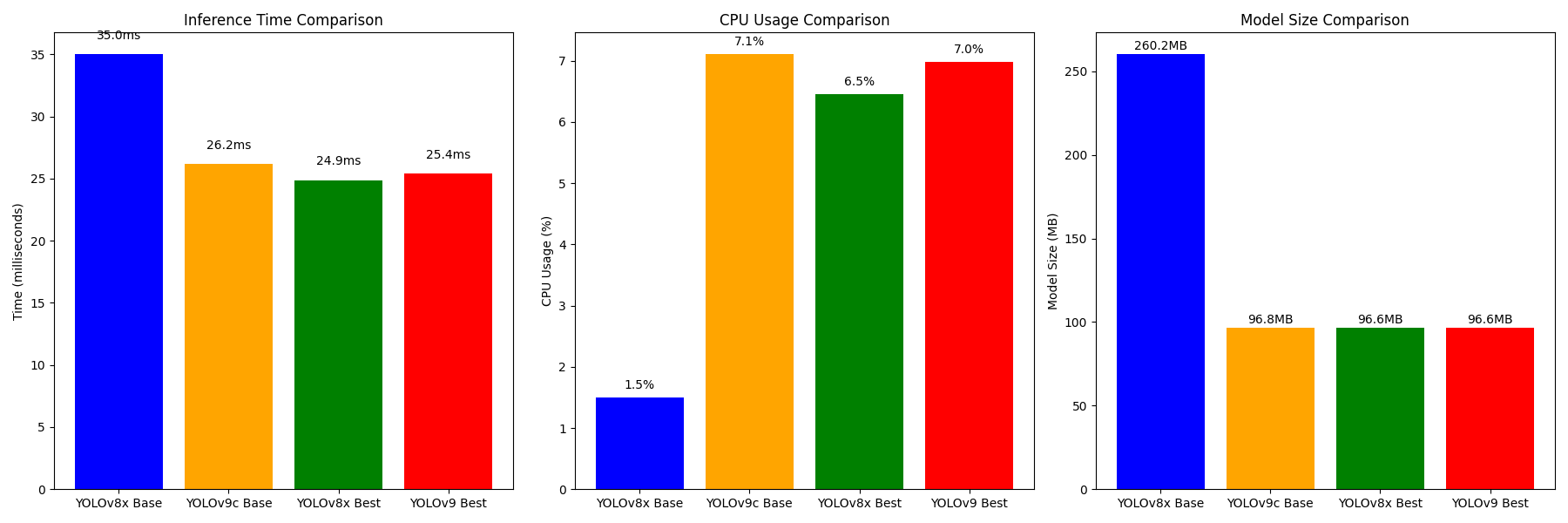 We ran comprehensive benchmarks comparing four configurations: YOLOv8x base, YOLOv9c base, and both architectures with custom-trained weights (best.pt).