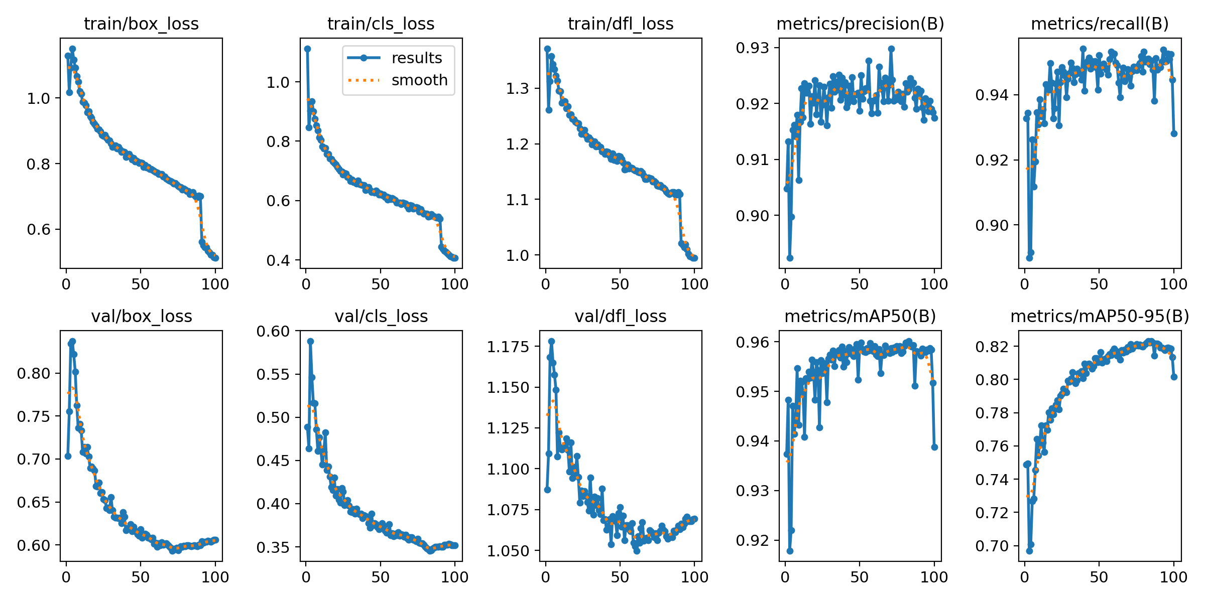 We trained the YOLOv9c model on CAETEC's dataset of 1,200 annotated images over 100 epochs. The training progression shows stable convergence: